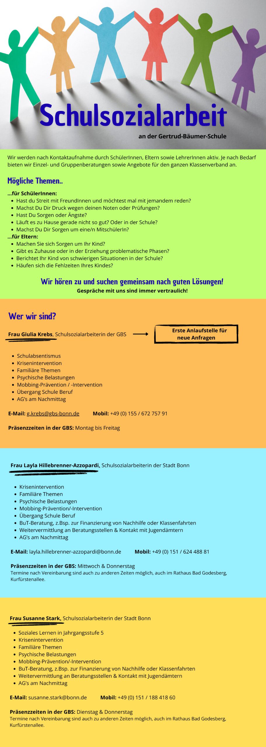 Lern-, Leistungs- und Verhaltensprobleme begleiten Schülerinnen und Schüler zunehmend. Die Gertrud-Bäumer-Realschule hat sich daher zum Ziel gesetzt, eine wirksame Präventions- und Beratungsarbeit zu leisten. Das Beratungsteam der GBS kann bei solchen Problemen angesprochen werden.